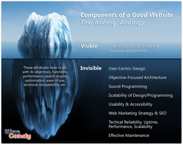 Design is considered the VISIBLE side of a web site, and the rest is considered INVISIBLE, or if you like numbers we are looking at a perspective 5 to 95 ratio. The Iceberg analogy is representative of the visible and invisible components of a web site.